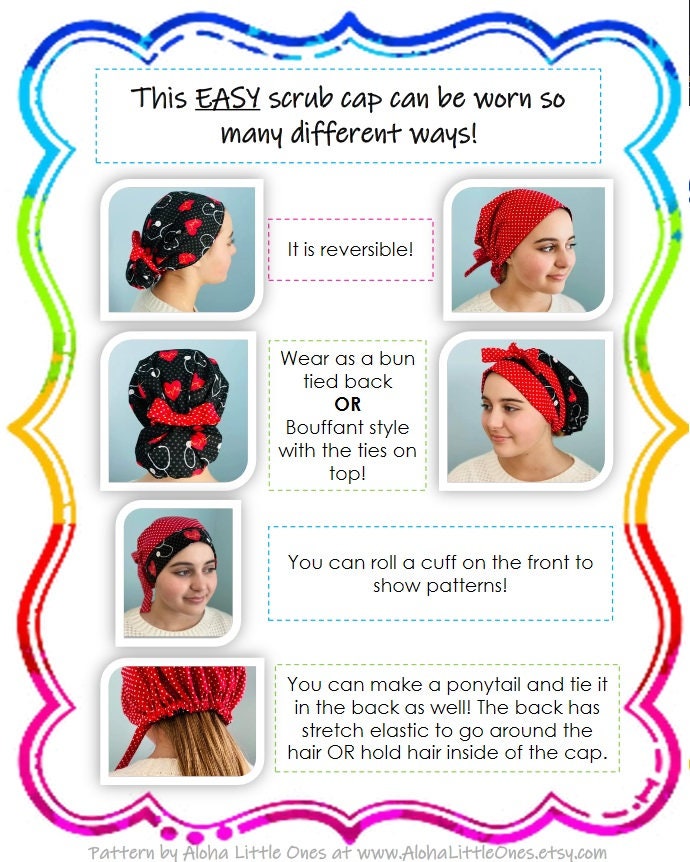 ♥ One Size Fits Most: This reversible scrub cap holds long or short hair. It can be tied and styled in numerous different ways (see photos).